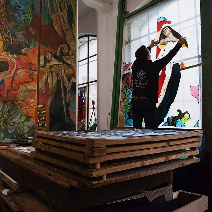The Workshop designs large-format stained glass sets, renovates and reconstructs historical works, and creates modern glass installations using artistic glass. The studio's main priorities encompass supreme aesthetic quality and technical diligence; stained glass windows are made using the traditional technique: mass-coloured glass, hand-cut and framed in lead. The designed characters, groups and landscapes are hand-painted using the best patinas, and then fired in a furnace at the glass melting point for eternal durability. The most interesting projects include sets of stained glass windows for the Church of Christ the King in Siedliska, for Saint Anthony Church in Gołkowice and the Sanctuary of Divine Mercy in Białystok.