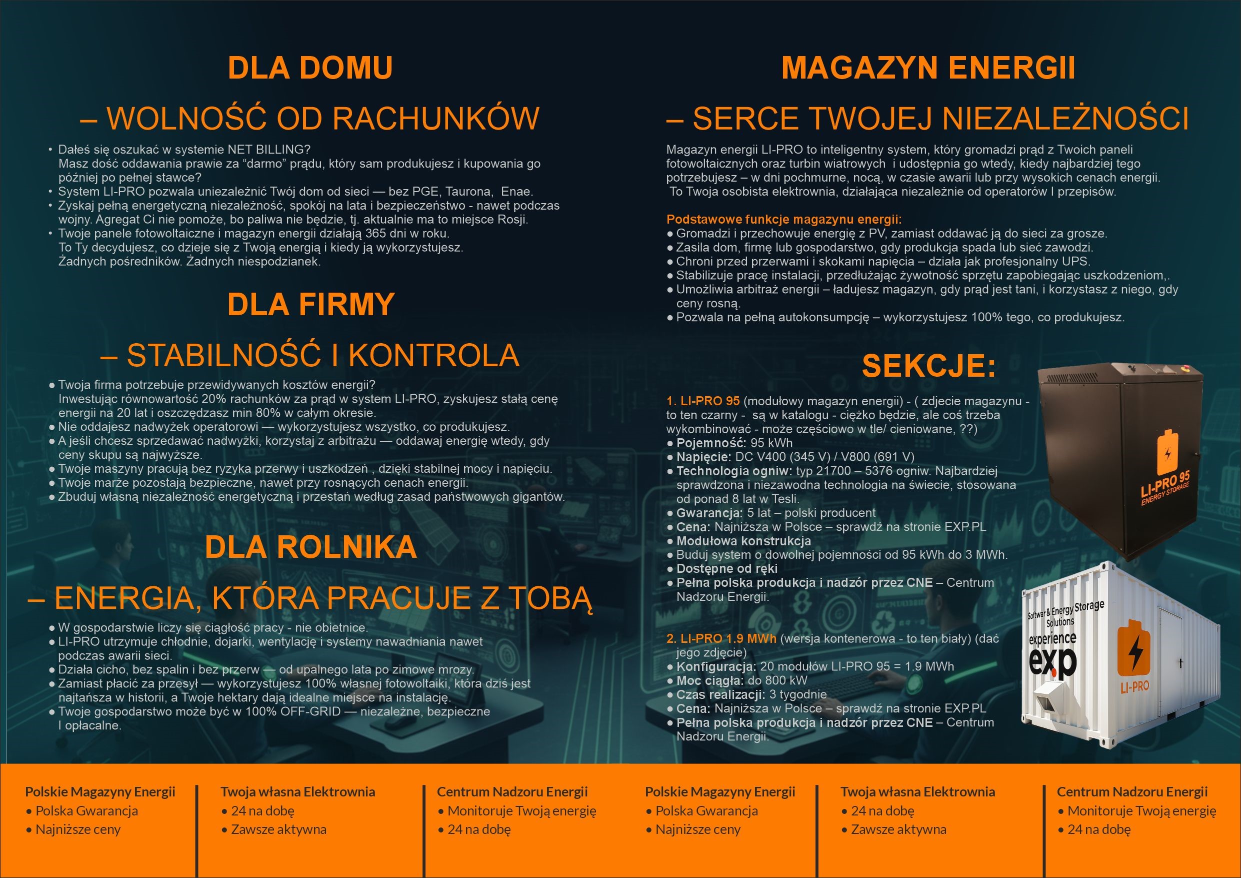 LI-PRO to zaawansowane systemy magazynowania energii elektrycznej, zaprojektowane tak, aby maksymalizować autokonsumpcję energii z instalacji PV i zapewniać dostęp do prądu wtedy, gdy jest najbardziej potrzebny. Rozwiązania EXP pozwalają gromadzić nadwyżki produkowane w ciągu dnia i wykorzystywać je nocą lub podczas awarii sieci.