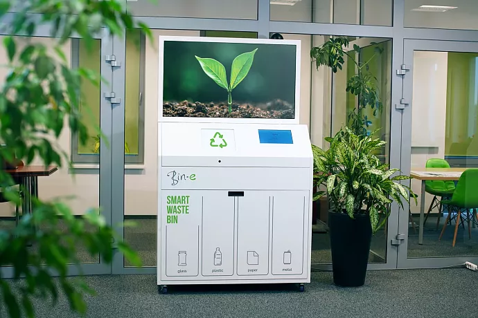 Bin-e to inteligentne urządzenie, wykorzystujące sztuczną inteligencję do ułatwienia recyklingu w przestrzeniach publicznych. Automatycznie sortuje i kompresuje odpady, kontroluje poziom wypełnienia oraz analizuje dane do optymalizacji procesów logistycznych.